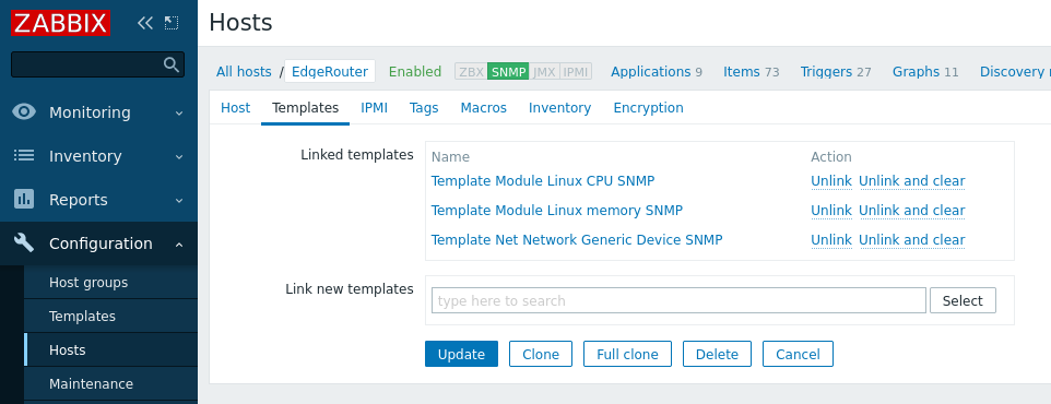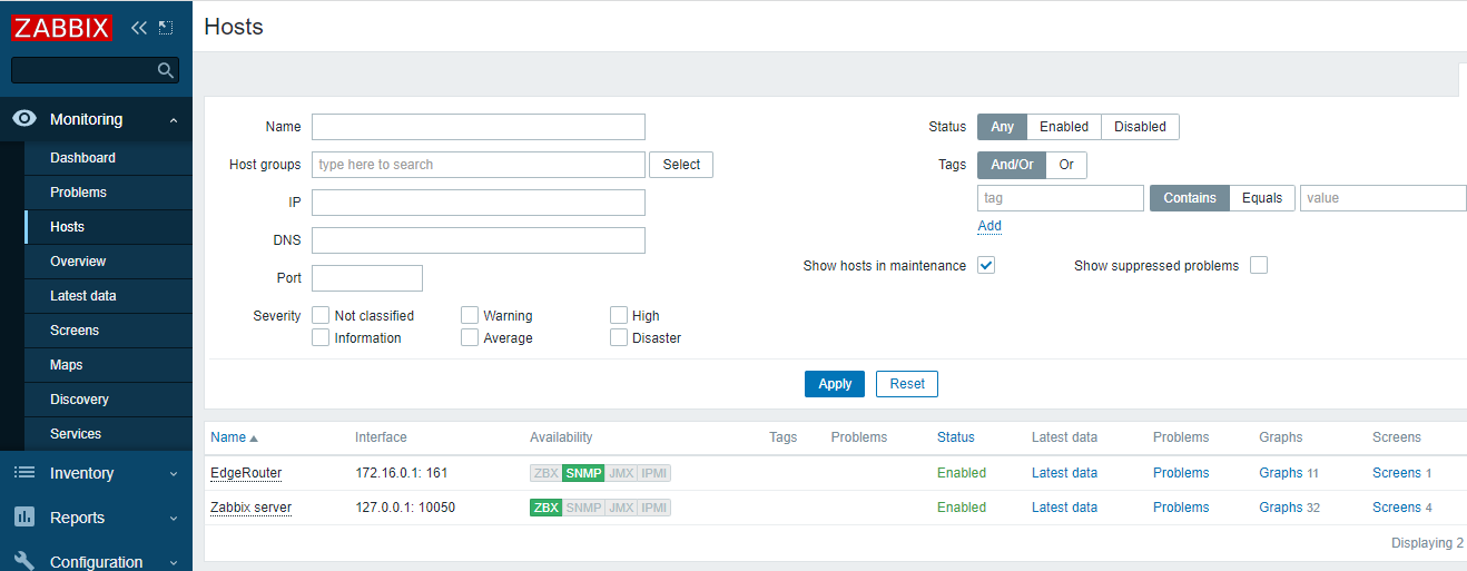 Monitoring > Hosts 에 등록한 EdgeRouter를 볼수 있다.