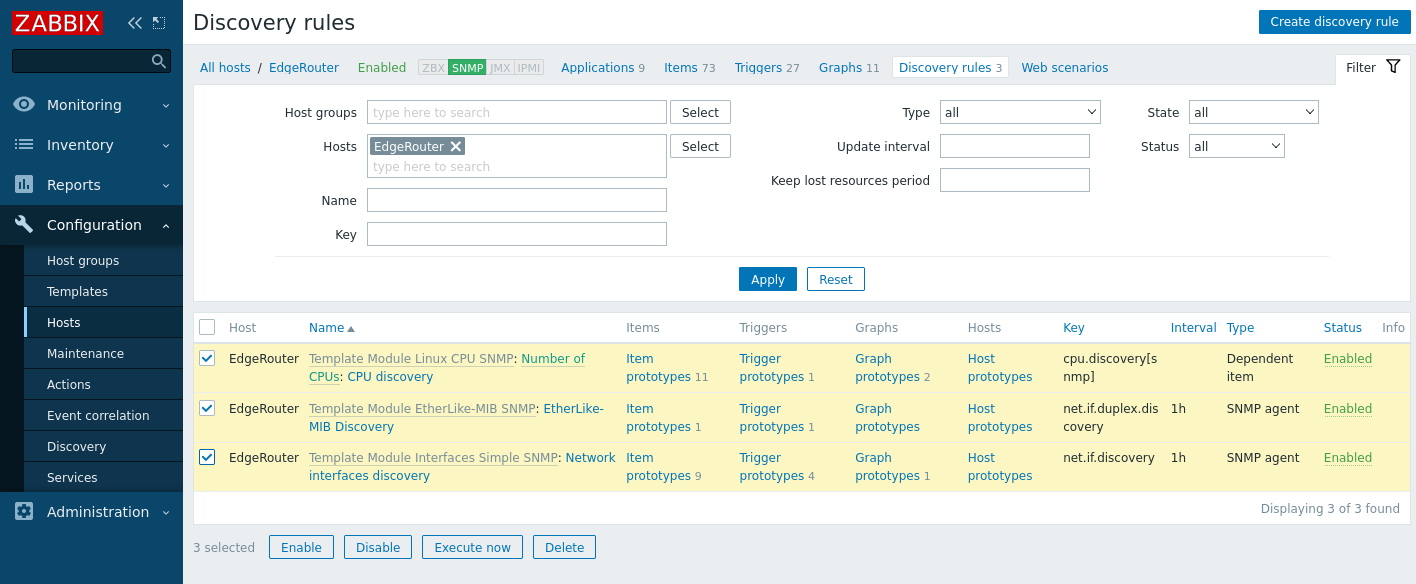 Discovery rules 항목에서 아래와 같이 항목들을 체크하고 Execute now 버튼을 눌러 수동으로 Discovery를 하여 바로 모니터링이 가능 하도록 하게 할 수 있다.