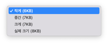 실제 크기가 아닌 다른 크기로 선택시, 새로 생성된 이미지 이름 끝에 해당 xxx작게.jpeg 와 같이 크기 이름이 뒤에 붙음