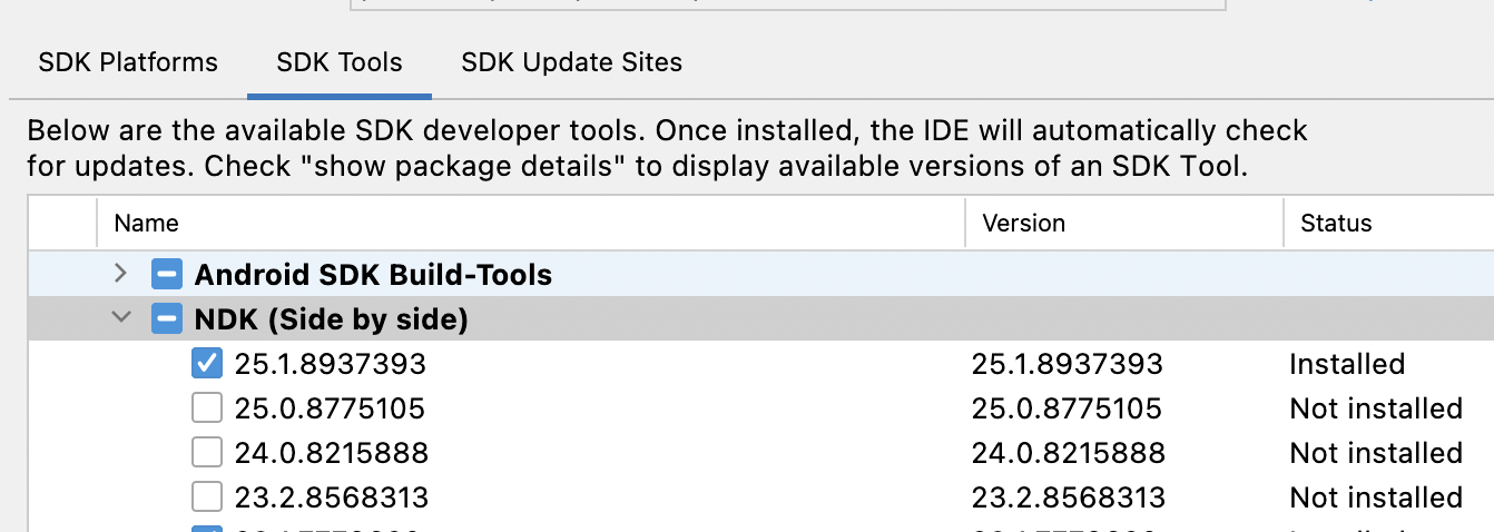 다음과 같이 ndk를 추가 후 앱 또는 라이브러리의 Build.gradle에 버전을 입력합니다.
